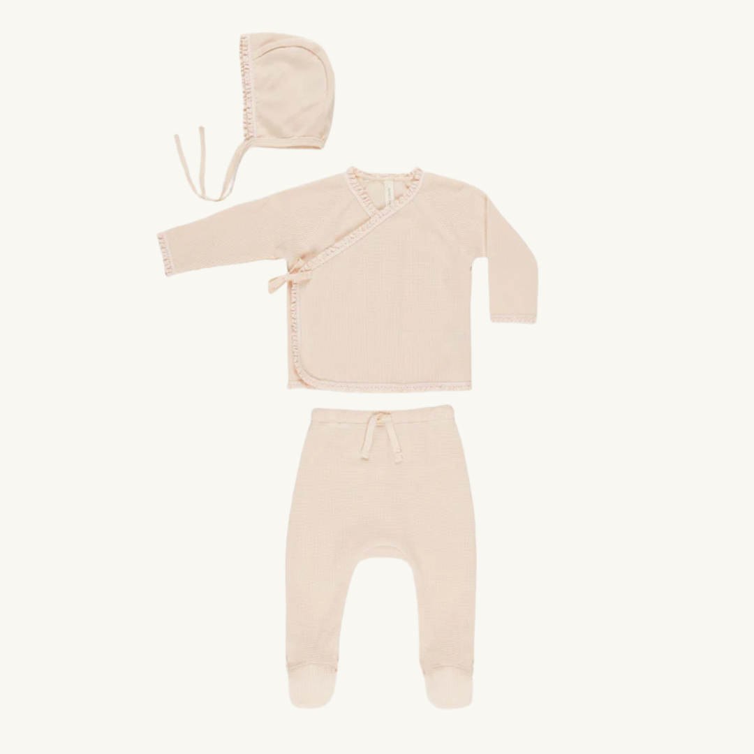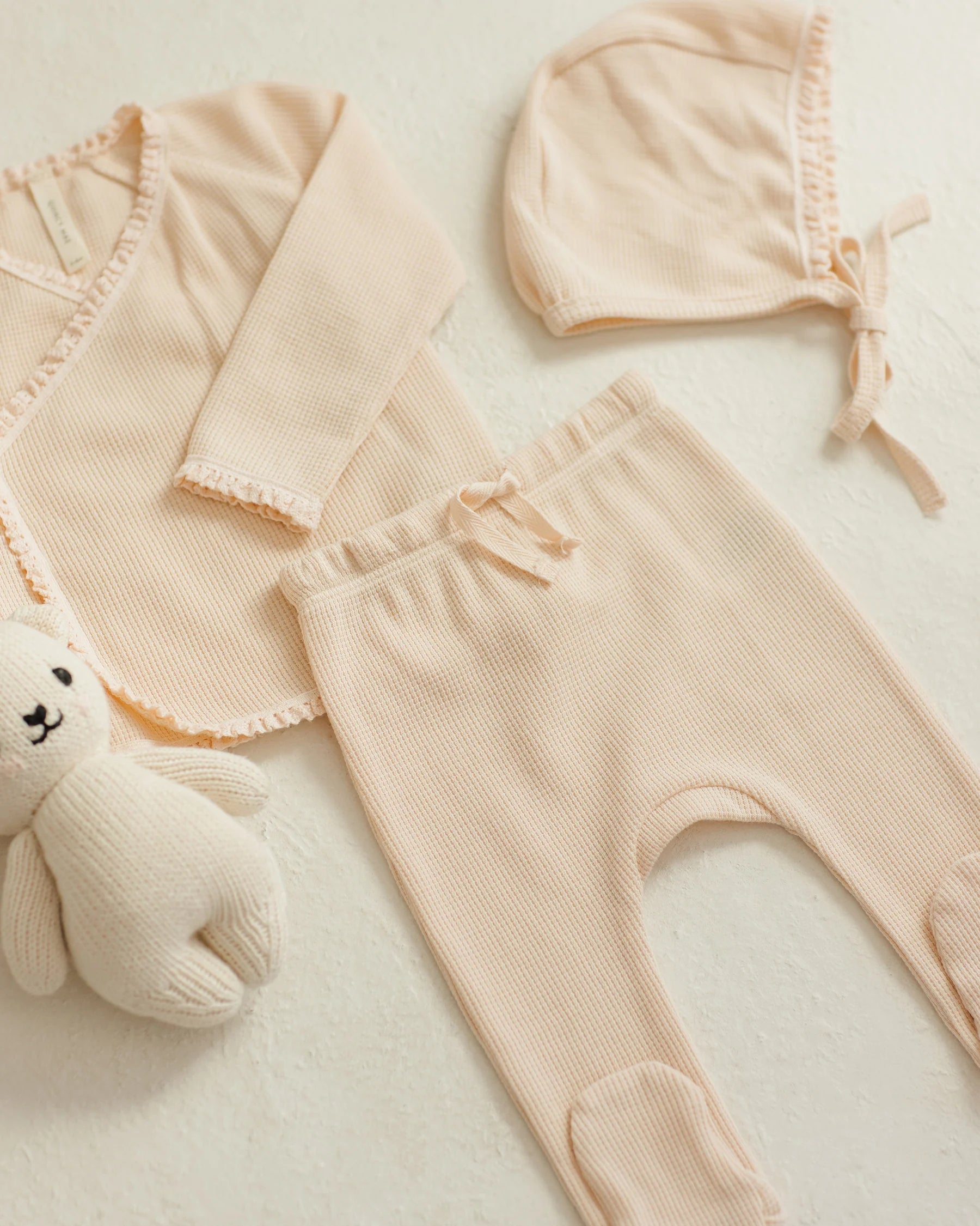 Quincy Mae Antique color waffle cotton three-piece set including a hat, a kimono opening top and matching pants.