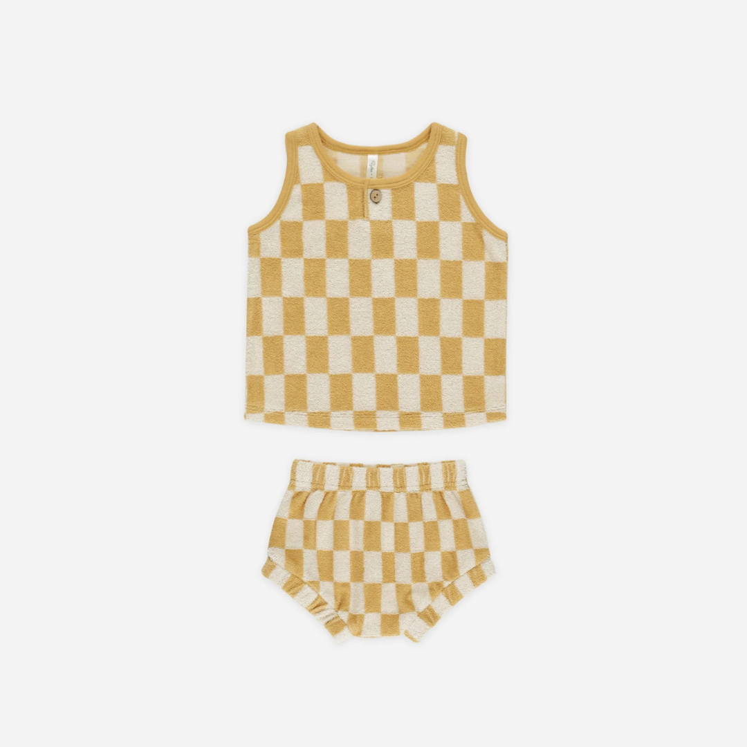 Cet ensemble en tissu éponge comprend un débardeur avec des détails boutonnés et un bloomer assorti avec une taille et des jambes élastiques.