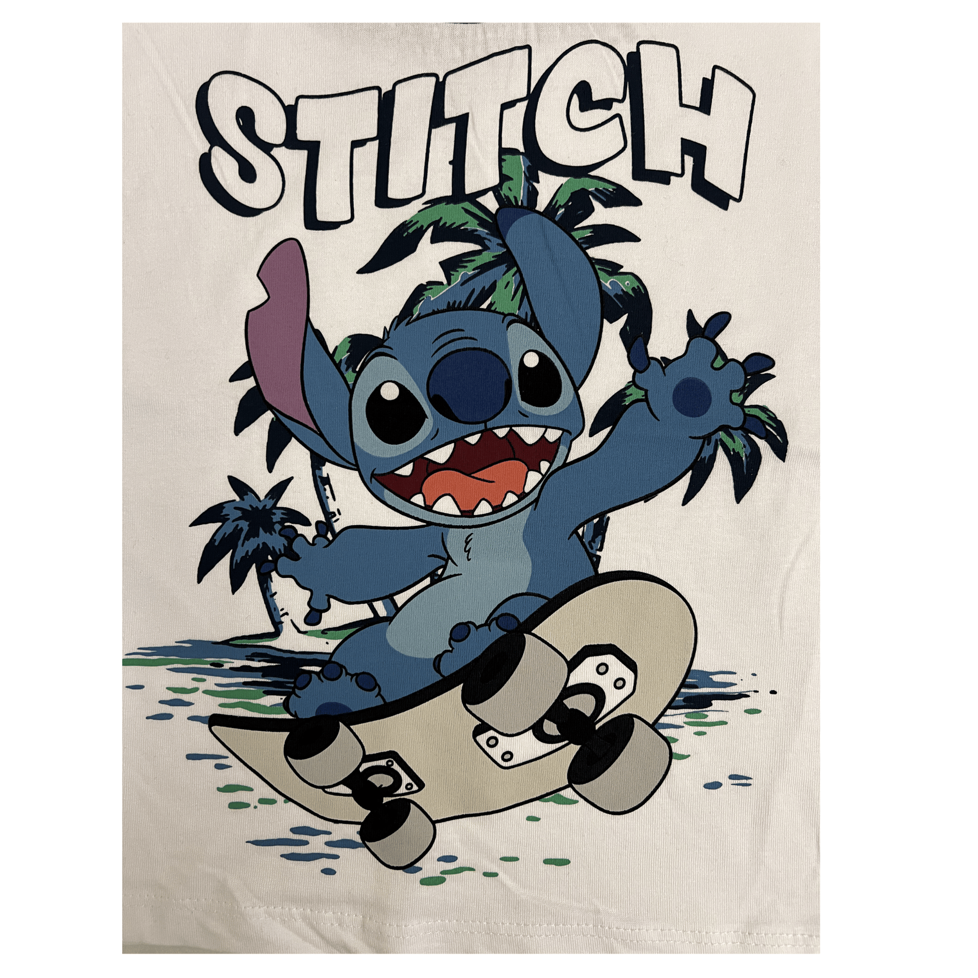 Chandail à manches courtes Stitch sur planche à roulette officiel avec imprimé sur le devant.