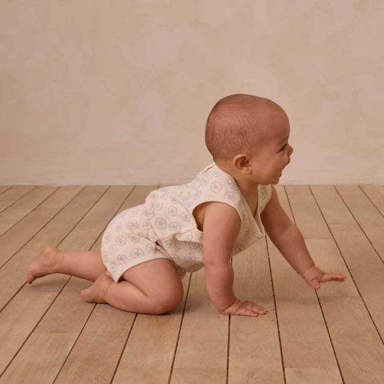 Combinaison gaufrée sans manches présente une taille cintrée et des boutons-pression au dos et au bas pour des changements faciles.
