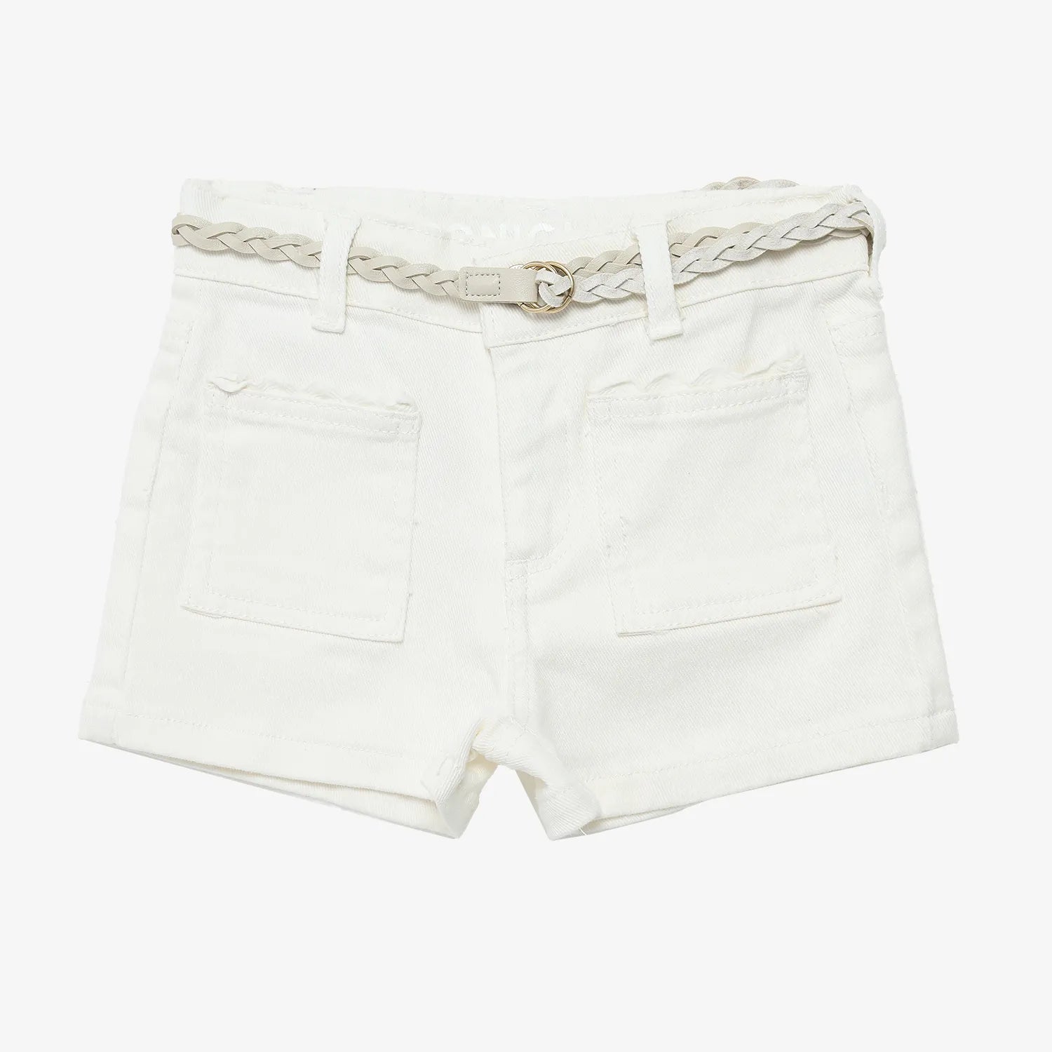 Short de jeans léger et extensible de couleur crème. Jolis détails aux poches à l'avant et ceinture décorative incluse. Boutons d'ajustements de la taille à l'intérieur.