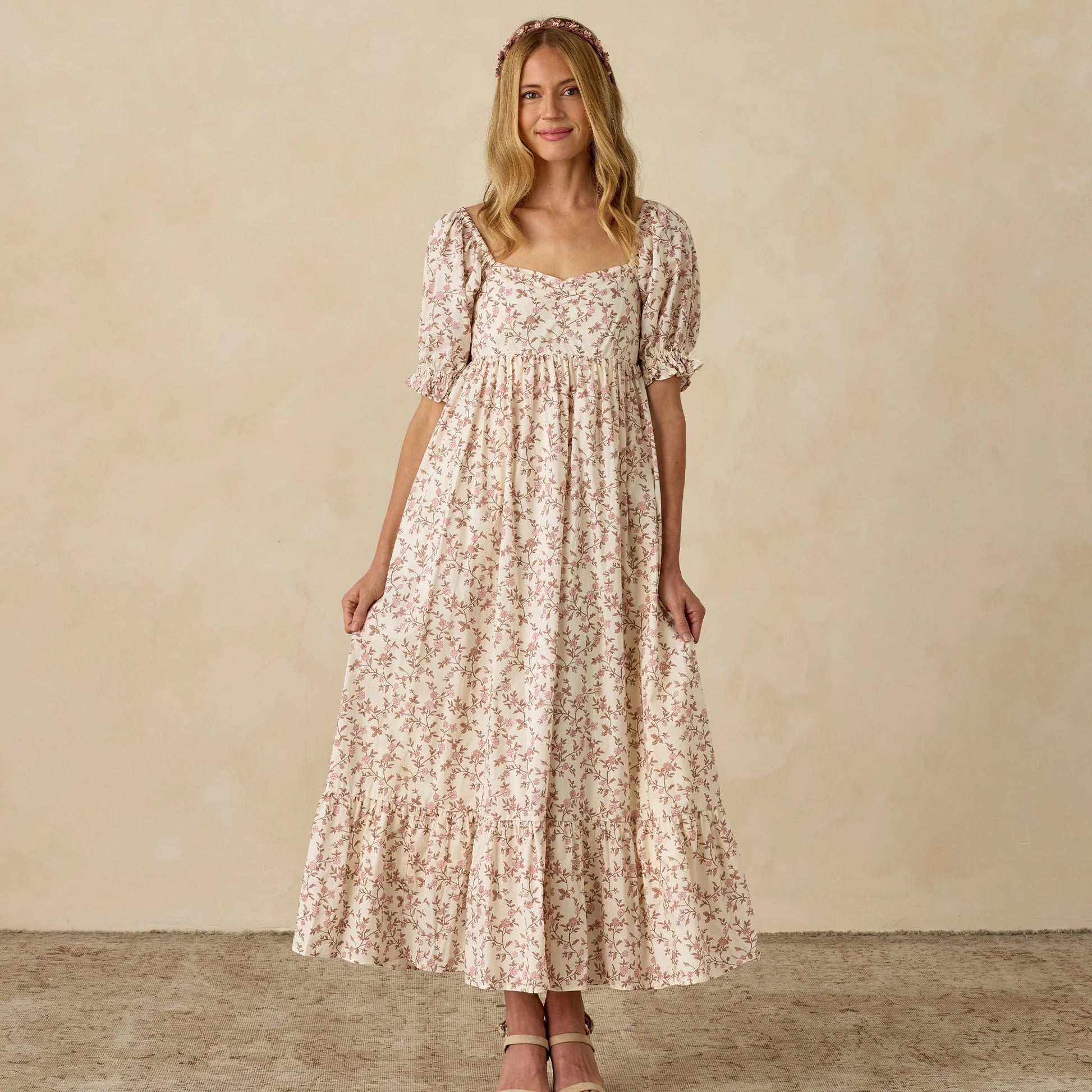 Noralee's Chloe dress features charming, lightly puffed sleeves with elasticated ruffle-trimmed cuffs, a tiered skirt, a smocked back, and ruched detailing on the front bodice for a flattering fit.