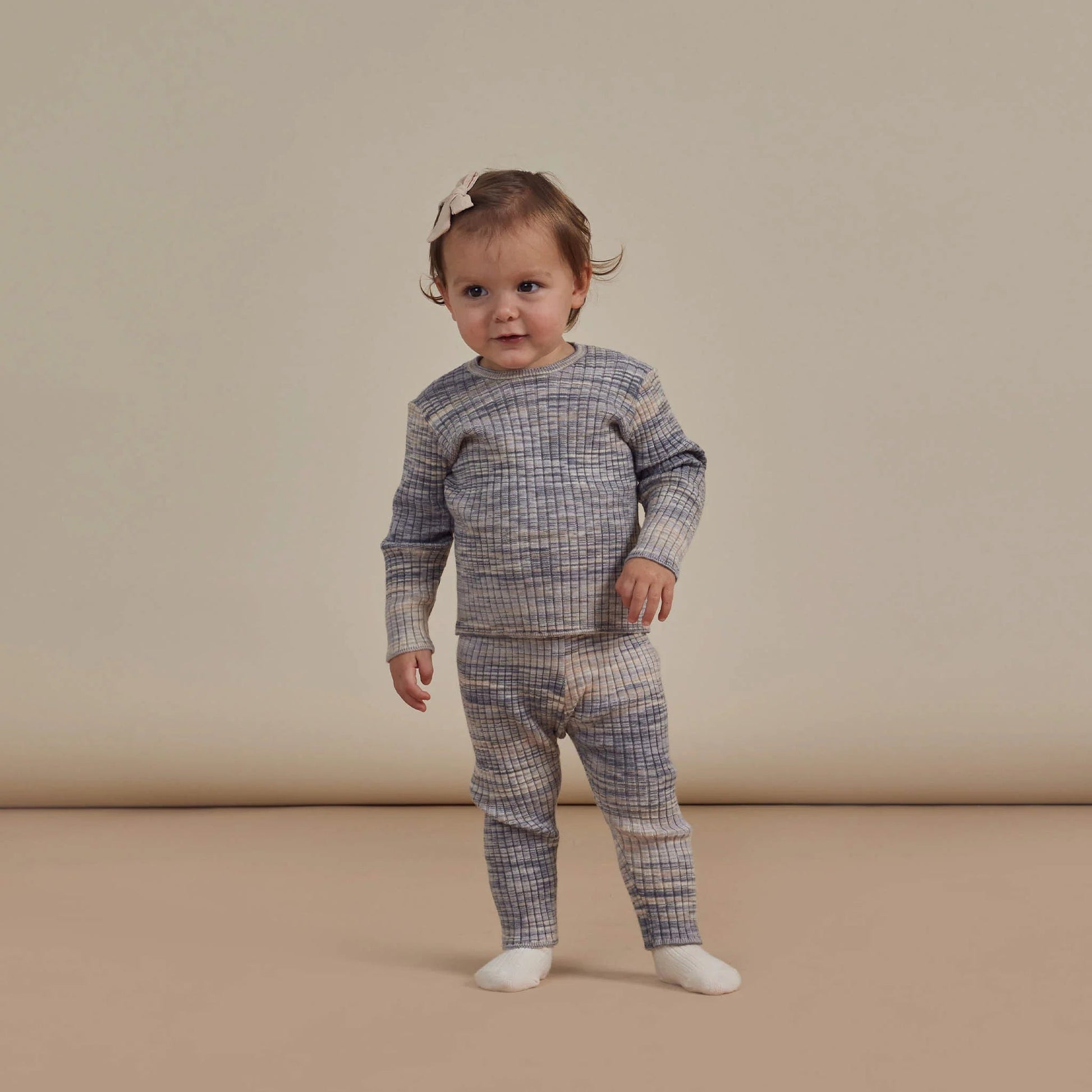 Ensemble de tricot doux et confortable au tissus marbré. Teinte de beige, crème et bleu. Adorable!
