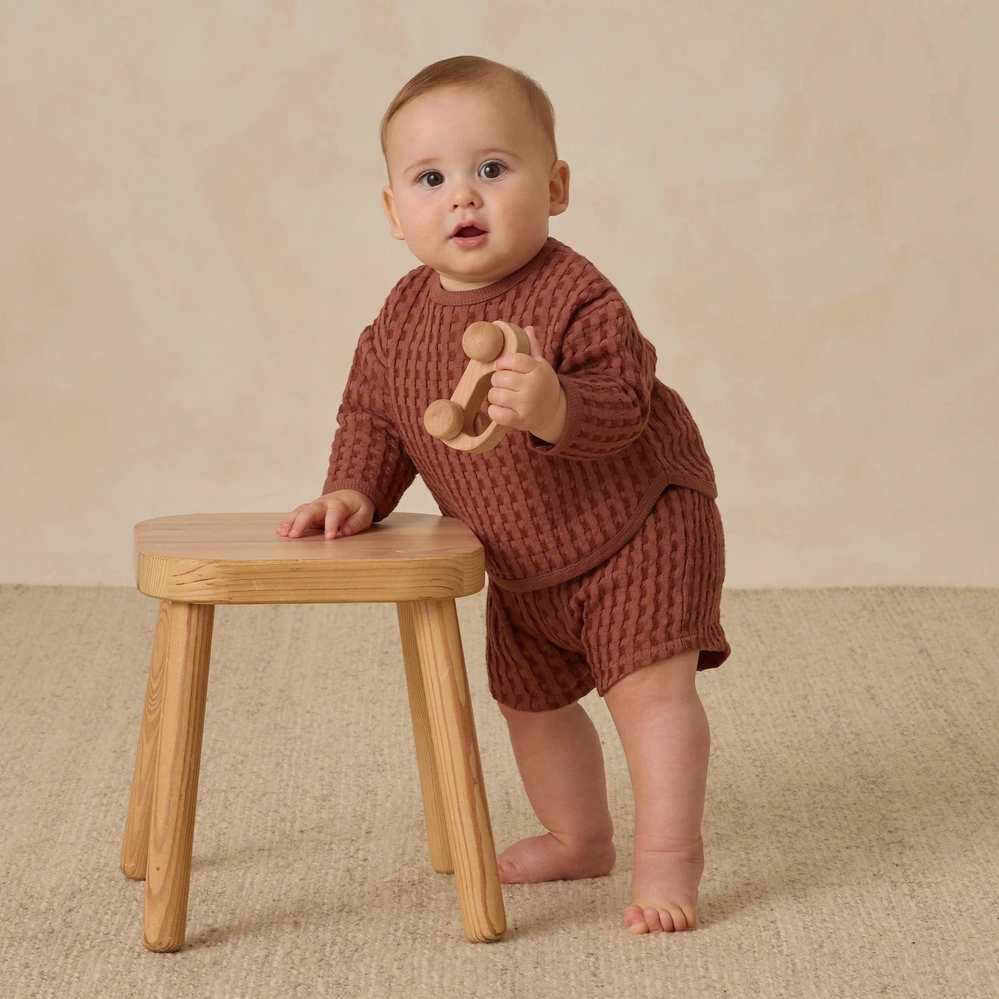 The Flynn set is crafted from our waffle knit and includes a boxy long-sleeved sweater with coconut buttons at the back of the neck, plus matching pull-on shorts for all-day comfort.