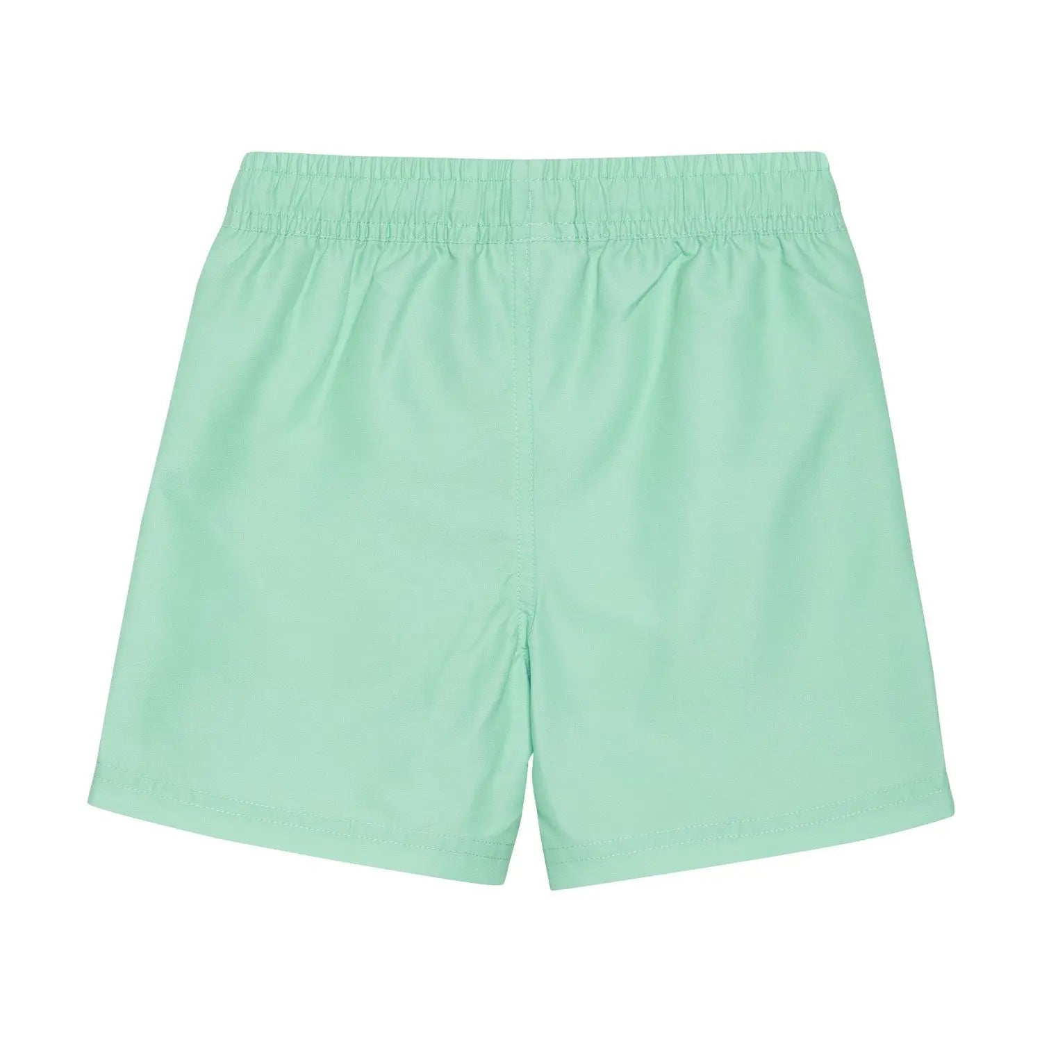 These swim shorts feature an elasticated ruched waist with a drawstring. They come in solid jade green and have a small detail on the bottom of the left leg, a "surfing minymo" patch. Inner mesh lining.